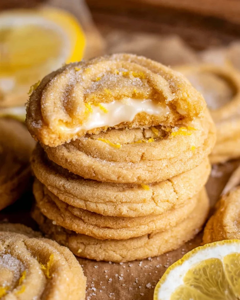 These cookies feature a chewy exterior with a creamy cheesecake center, brightened by zesty lemon. Perfect for any occasion, they are delightful and easy to make.