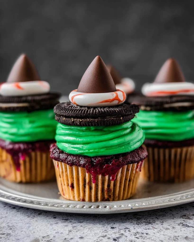 Once your cupcakes are beautifully frosted, carefully place each Oreo with the attached Hershey’s Kiss on top. This final touch completes your witch hat presentation, giving each cupcake a charming and spooky flair that’s simply irresistible.